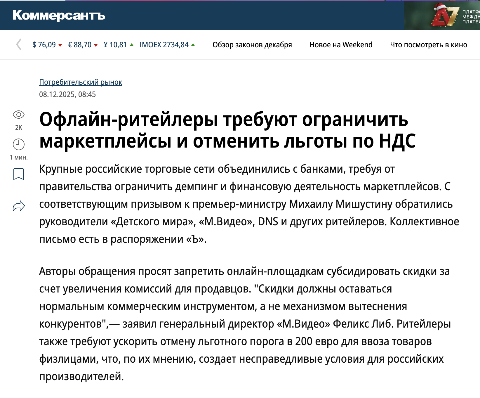Офлайн-ритейлеры требуют ограничить маркетплейсы и отменить им льготы по НДС